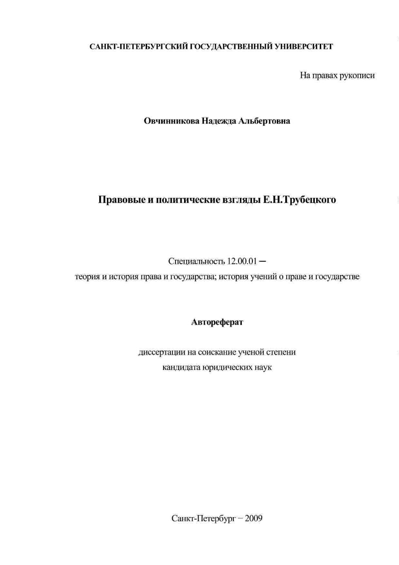 Правовые и политические взгляды Е. Н. Трубецкого : автореферат диссертации на соискание ученой степени кандидата юридических наук : специальность 12.00.01 / Овчинникова Надежда Альбертовна ; Санкт-Петербургский Государственный Университет. - Санкт-Петербург, 2009. - 27,[1] с. - Библиогр.: с.27-28