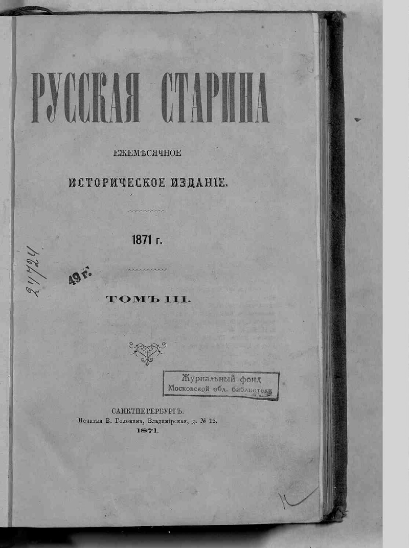 Г. 2 1871, т. 3, [кн. 1-6, январь-июнь]. - Печатня В. И. Головина, 1871. - 794, VIII, 2 с., 141 стб. - Содерж.: Моя боевая жизнь: (записки Войска Донского генерал-лейтенанта Якова Петрова Бакланова, написанные собственною его рукою). Записка В. Н. Каразина, представленная Императору Александру I чрез Министра Внутренних Дел гр. В. П. Кочубея / В. Каразин. Статс-дамы и фрейлины русского двора в XVIII столетии : биографические списки П. Ф. Карабанова. Архив князя М. И. Голенищева-Кутузова-Смоленского, (1745-1813), ныне принадлежащий правнуку его Ф. К. Опочинину. Русские воспитательницы. Луиза Федоровна Вистингаузен, начальница патриотического института : биографический очерк / сообщ. П. К. Яковлев, и другие материалы. - Указатель личных имен: стб. 1-141. - Библиография в подстрочных примечаниях. - Экземпляр МОГНБ дефектный. Отсутствуют страницы: 75-394, 386, 461-472, 685-688