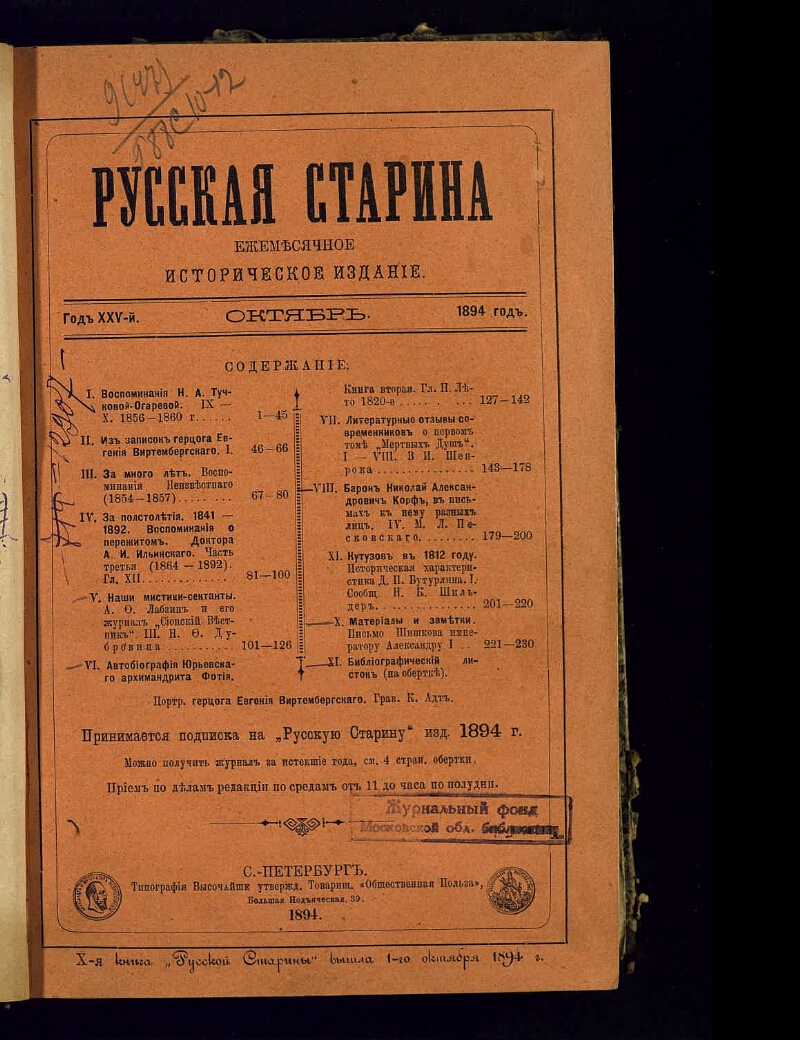 Г. 25 1894, Т. 82, [кн. 10-12], октябрь-декабрь. - 1894. - Содерж.: Кн. 10: Воспоминания Н. А. Тучковой-Огаревой. 9-10. 1856-1860 г. Из записок герцога Евгения Виртембергского. 1. За много лет. Воспоминания Неизвестного (1854-1857). За полстолетия. 1841-1892. Воспоминания о пережитом. Доктора А. И. Ильинского. Часть 3 (1864-1892). Гл. 12. Наши мистики-сектанты. А. Ф. Лабзин и его журнал "Сионский Вестник". 3 / Н. Ф. Дубровин [и др.]. Кн. 11: Воспоминания Н. А. Тучковой-Огаревой. 11-12. 1856-1860 г. Записки В. А. Инсарского. Гл. 17-18. Наши мистики-сектанты. А. Ф. Лабзин и его журнал "Сионский вестник". 4. / Н. Ф. Дубровин. За полстолетия. 1841-1892. Воспоминания о пережитом. Доктора А. И. Ильинского. Часть 3 (1864-1892). Гл. 13. Отзывы современников о "Переписке с друзьями" Гоголя. 1-13 / В. И. Шенрок [и др.]. Кн. 12: Памяти императора Александра III. Воспоминания Н. А. Тучковой-Огаревой. 13-14. 1856-1860 г. Записки В. А. Инсарского. Гл. 19-20. Записки Д. И. Ростиславова, профес. Спб. духовной академии. Гл. 39-41. Сведения об Иоанне или Иване Антоновиче, правнуке царя Иоанна Алексеевича [и др.]. - В экземпляре МОГНБ книги 10-12 переплетены в одну обложку