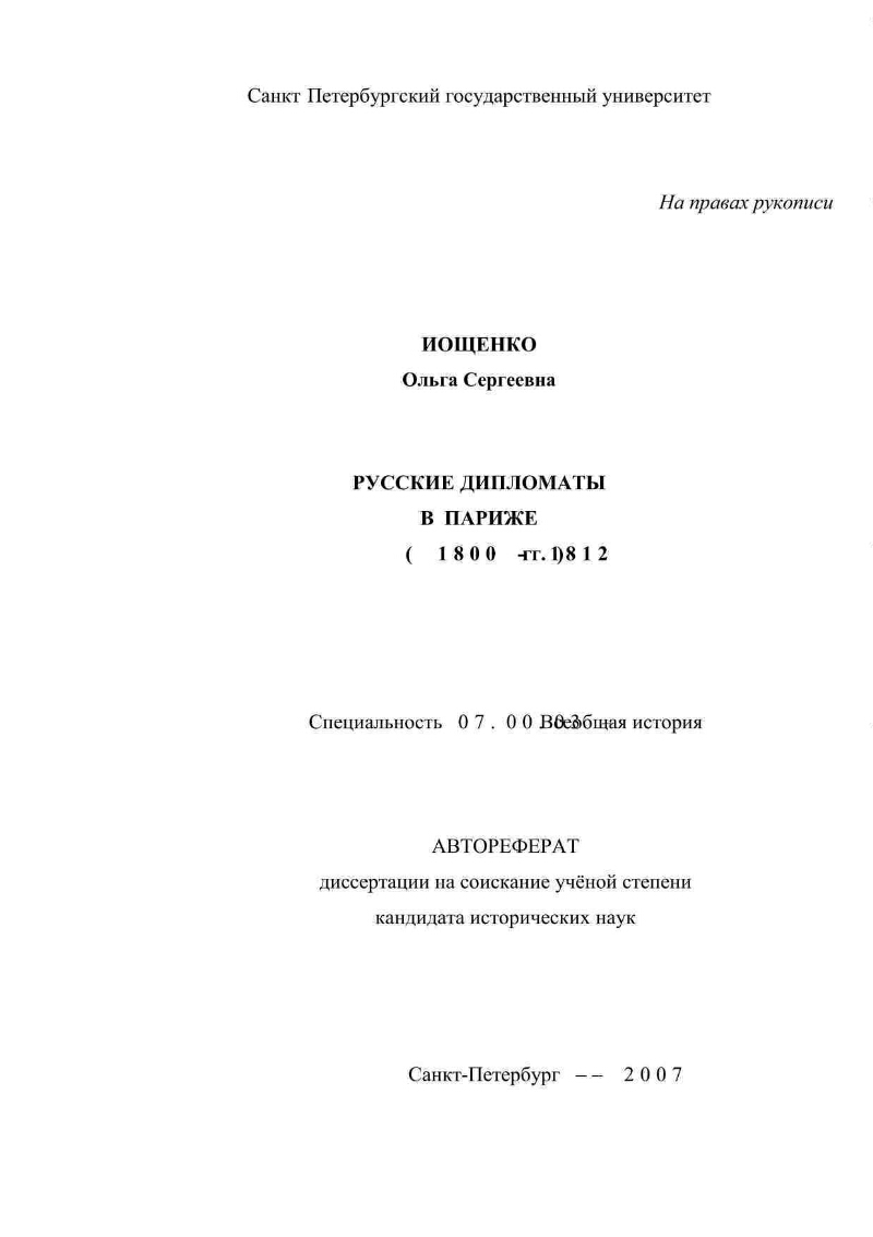 Русские дипломаты в Париже : (1800 - 1812 гг.) : автореферат диссертации на соискание ученой степени кандидата исторических наук : специальность 07.00.03 / Иощенко Ольга Сергеевна ; С.-Петерб. гос. ун-т. - Санкт-Петербург, 2007. - 23 с. ; 21. - Библиогр.: с. 23 (4 назв.) и в подстроч. примеч.