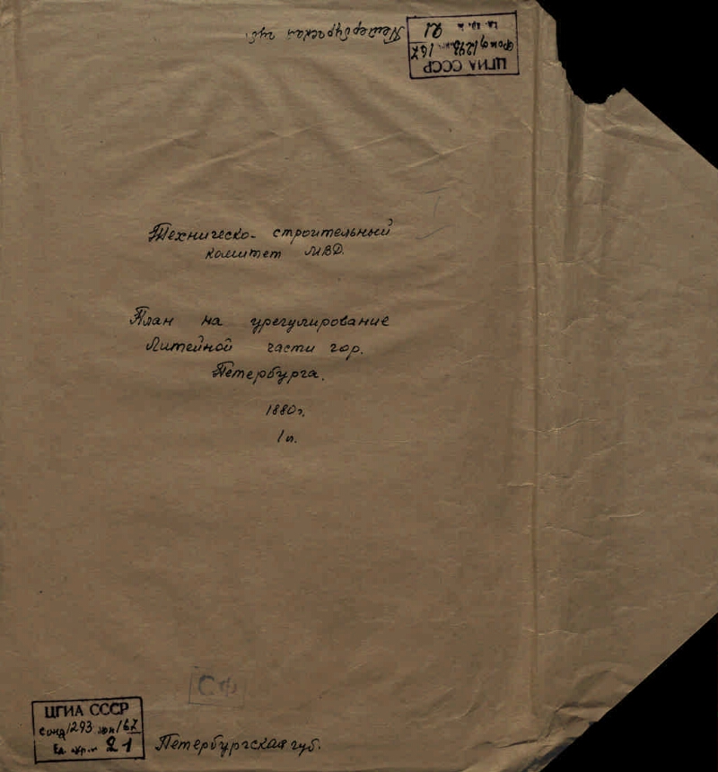 С.-Петербургская губерния. План на урегулирование Литейной части. 1880 г. [Дело]. - 1880. - 2 листа. - (Фонд Техническо-строительный комитет МВД. Опись № 167. Петербургская губ.). - Заголовок дела на папке: План на урегулирование Литейной части гор. Петербурга : 1880. Рукописный текст. Бумага. Тушь, карандаш, акварель. В деле содержится 1 документ: План предполагаемого урегулирования улиц Литейной части. Масштаб: в одном английском дюйме 200 саженей