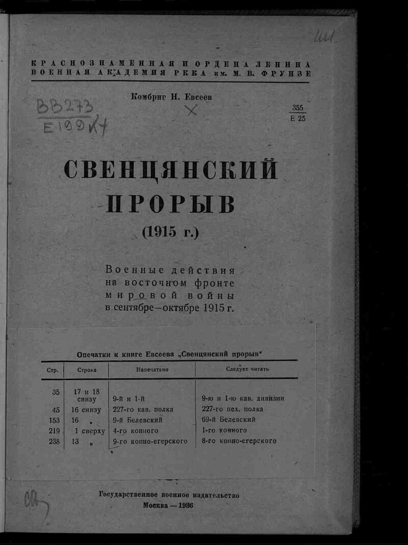 Свенцянский прорыв (1915 г.) : военные действия на восточном фронте мировой войны в сентябре-октябре 1915 г. / Комбриг Н. Евсеев ; Краснознаменная и ордена Ленина Военная академия РККА им. М. В. Фрунзе. - Москва : Государственное военное издательство, 1936. -268, [4] с. : табл. ; 23х16 см. - Список трудов, использованных авт.: с. 268. - Библиография в примечаниях.