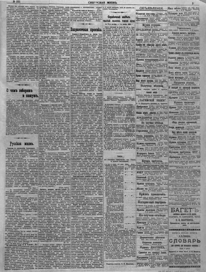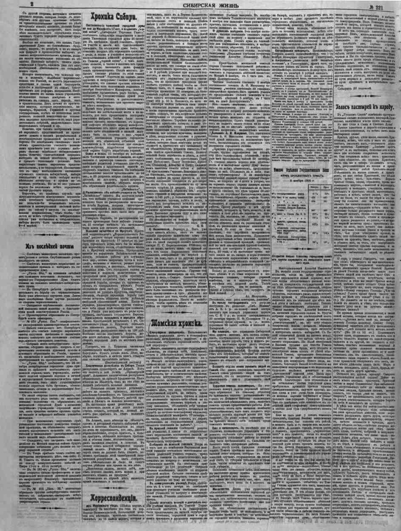 Сибирская жизнь : газета политическая, литературная и экономическая. - Томск, 1894, 2 июля - 1919, 21 декабря. - Заглавия: 1894, № 1 (2 июля) - 1895, № 115 (4 июня) Томский справочный листок ; 1895, № 116 (6 июня) - 1897, № 234 (31 октября) Томский листок. Редакторы: П. И. Макушин (1894-1905), проф. И. А. Малиновский и проф. М. Н. Соболев (1905-1908), М. Р. Бейлин (1908), В. Л. Малеев (1910), Г. Б. Баитов (1910-1912, 1916), П. А. Таловский (1912), Т. В. Каплин (1913-1914), Г. И. Козлов (1914, 1916), А. В. Адрианов (1917). Издатели: П. И. Макушин (1894-1905), И. А. Малиновский и М. Н. Соболев (1905-1908), М. Р. Бейлин (1908), В. Л. Малеев (1910), Сибирское товарищество печатного дела (1910-1918). Перерыв в издании: 1906, 11-27 октября ; 1906, 9 ноября - 1907, 9 апреля. В перерывах издавалась газета "Сибирская мысль", которая рассылалась подписчикам. Приложения: Иллюстрированное приложение к газете "Сибирская жизнь" : [еженедельная хроника]. 1903-1906, 1908, 1910-1914 ; Сибирская жизнь : [литературное приложение]. 1906 ; Народные нужды. 1906 ; Город Томск. [Томск], 1912. 507 с. разд. паг. ; Телеграммы "Сибирской жизни". 1914-1917 ; Приложения к отдельным номерам. 1902-1904, 1906, 1908, 1911-1917. Тираж: в 1905 г. 15 тыс. экз., в 1909 г. около 9 тыс. экз., в 1914-1918 гг. до 25 тыс. экз. Выходит ежедневно, исключая дней после праздников. Ежедневная общедоступная газета, с 1908 года — газета политическая, литературная и экономическая
