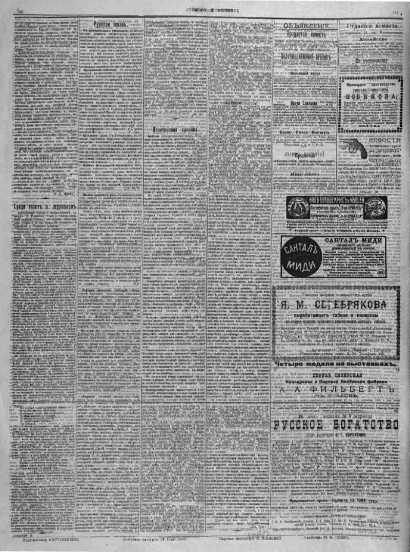 Сибирский вестник политики, литературы и общественной жизни. - 1885, 16 мая - 1905, 31 декабря. - Томск, 1885-1905. - Редакторы: В. П. Картамышев (до 1894 г.), Г. В. Прейсман (1894-1901), М. Ф. Картамышева (1901-1902), Н. Н. Соин (1902-1905). Издатели: В. П. Картамышев, М. Ф. Картамышева, М. Н. Загибалов. Перерыв в издании: 1888, 20 мая - 1 сентября ; 1897, 21 мая - 16 декабря. В 1888-1895 гг. выходили приложения к отдельным номерам. Выходит ежедневно, кроме дней после праздничных. Ежедневная газета политики, литературы и общественной жизни. Основана В. П. Картамышевым. Издавалась в 1885-1905 гг. в Томске. Периодичность: 1885-1893 гг. – 1-3 раза в неделю, с 1894 г. – ежедневно