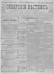 Сибирский вестник политики, литературы и общественной жизни. - 1885, 16 мая - 1905, 31 декабря. - Томск, 1885-1905. - Редакторы: В. П. Картамышев (до 1894 г.), Г. В. Прейсман (1894-1901), М. Ф. Картамышева (1901-1902), Н. Н. Соин (1902-1905). Издатели: В. П. Картамышев, М. Ф. Картамышева, М. Н. Загибалов. Перерыв в издании: 1888, 20 мая - 1 сентября ; 1897, 21 мая - 16 декабря. В 1888-1895 гг. выходили приложения к отдельным номерам. Выходит ежедневно, кроме дней после праздничных. Ежедневная газета политики, литературы и общественной жизни. Основана В. П. Картамышевым. Издавалась в 1885-1905 гг. в Томске. Периодичность: 1885-1893 гг. – 1-3 раза в неделю, с 1894 г. – ежедневно