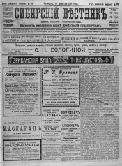 Сибирский вестник политики, литературы и общественной жизни. - 1885, 16 мая - 1905, 31 декабря. - Томск, 1885-1905. - Редакторы: В. П. Картамышев (до 1894 г.), Г. В. Прейсман (1894-1901), М. Ф. Картамышева (1901-1902), Н. Н. Соин (1902-1905). Издатели: В. П. Картамышев, М. Ф. Картамышева, М. Н. Загибалов. Перерыв в издании: 1888, 20 мая - 1 сентября ; 1897, 21 мая - 16 декабря. В 1888-1895 гг. выходили приложения к отдельным номерам. Выходит ежедневно, кроме дней после праздничных. Ежедневная газета политики, литературы и общественной жизни. Основана В. П. Картамышевым. Издавалась в 1885-1905 гг. в Томске. Периодичность: 1885-1893 гг. – 1-3 раза в неделю, с 1894 г. – ежедневно