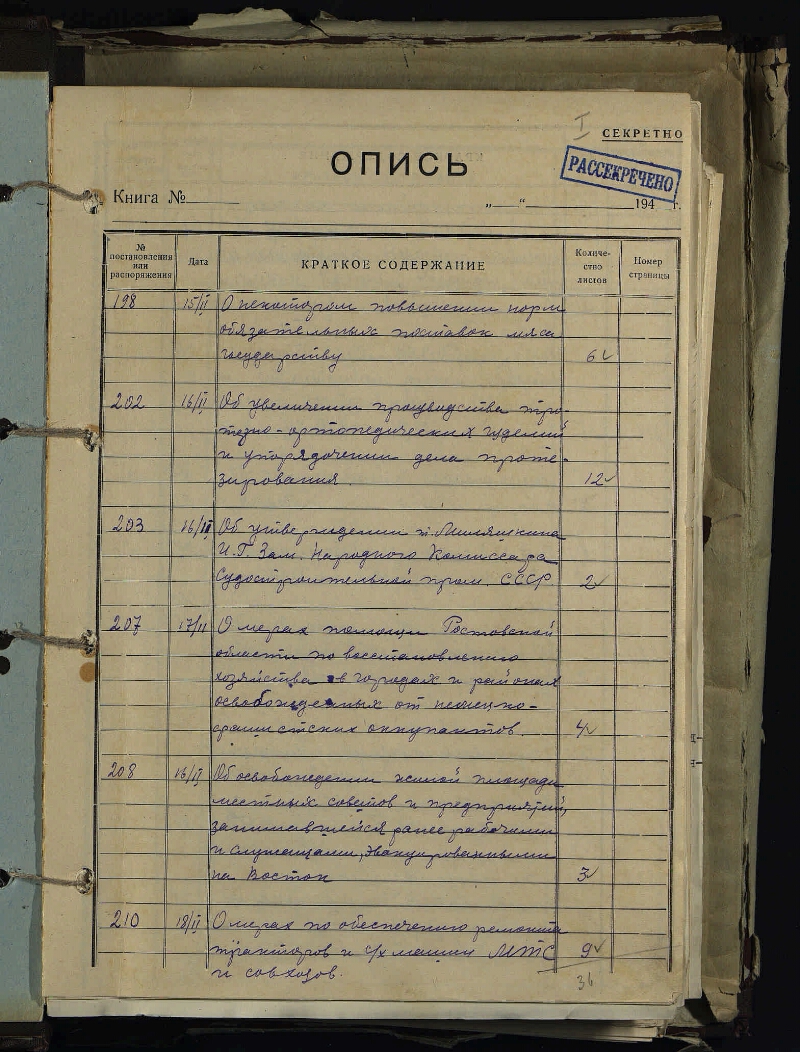 | Примечания | Заголовок дела на папке: Оригиналы Постановлений Совнаркома Союза ССР и Совнаркома Союза ССР и ЦК ВКП(б) Листы I-V - внутренняя опись Часть документов рукописная, часть - машинописная, часть напечатана типографским способом |
