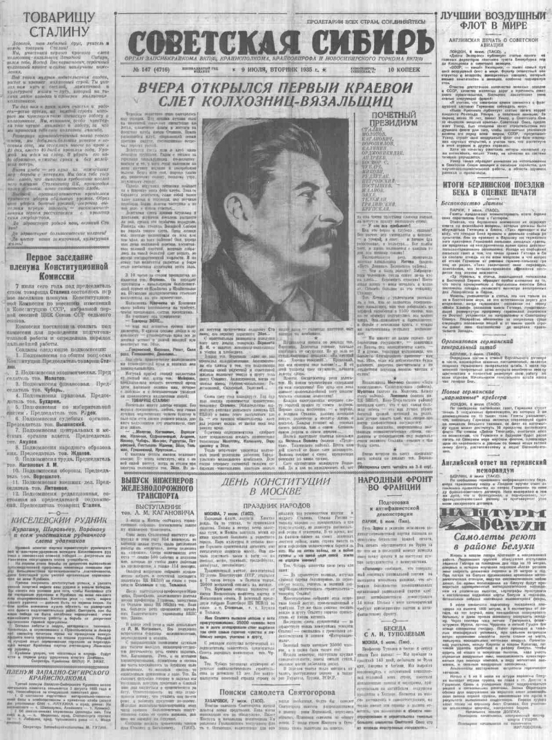 Описание Советская Сибирь : орган Новосиб. обкома и горкома ВКП(б) и обл. Совета депутатов трудящихся 1935, № 147 (4716) (9 июля). - 1935. - 4 с . Источник электронной копии: Новосибирская ГОНБМесто хранения оригинала: Новосибирская ГОНБ В коллекциях Отечественная периодика в фонде Президентской библиотеки → Газеты → С → Советская Сибирь : орган Новосиб. обкома и горкома ВКП(б) и обл. Совета депутатов трудящихся. Новосибирск. → 1935