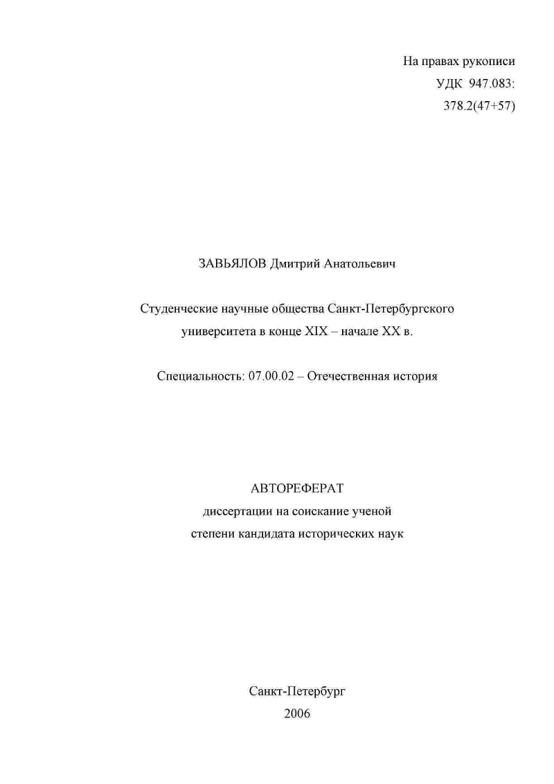 Студенческие научные общества Санкт-Петербургского университета в конце XIX - начале XX в. : автореферат диссертации на соискание ученой степени кандидата исторических наук : специальность 07.00.02 / Завьялов Дмитрий Анатольевич ; [Рос. гос. пед. ун-т им. А. И. Герцена]. - Санкт-Петербург, 2006. - 24 с. ; 21. - Место защиты: Рос. гос. пед. ун-т им. А. И. Герцена. - Библиогр.: с. 23 (4 назв.) и в подстроч. примеч. - 100 экз.