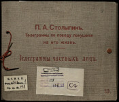Телеграммы разных лиц к О. Б. Столыпиной с выражением соболезнования по поводу убийства П. А. Столыпина [Дело] : сентябрь 1911 г. - 1911. - 204 л.. - (Фонд Столыпин Петр Аркадьевич (1862-1911), Министр внутренних дел, Председатель Совета Министров. Опись № 1). - Загл. на папке: П. А. Столыпин. Телеграммы по поводу покушения на его жизнь. Телеграммы частных лиц. Материалы о покушении Богрова и о смерти Столыпина П. А.