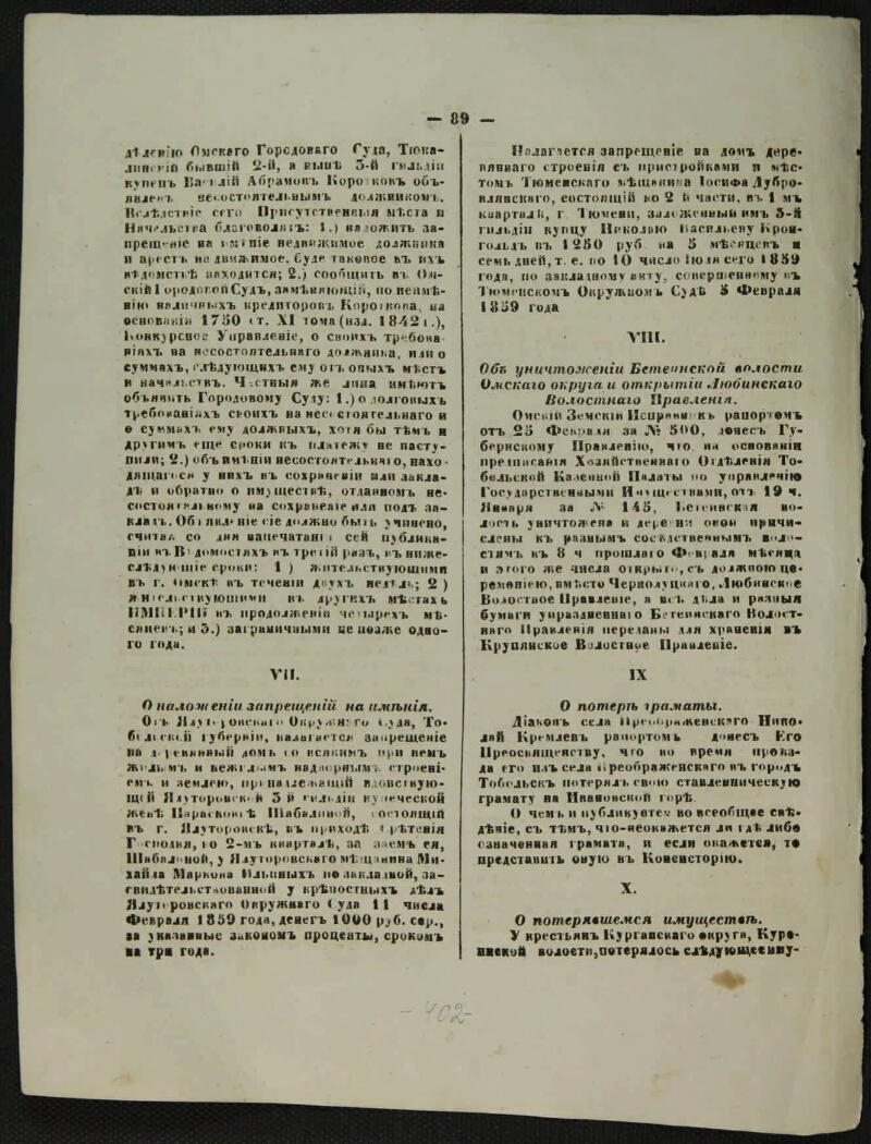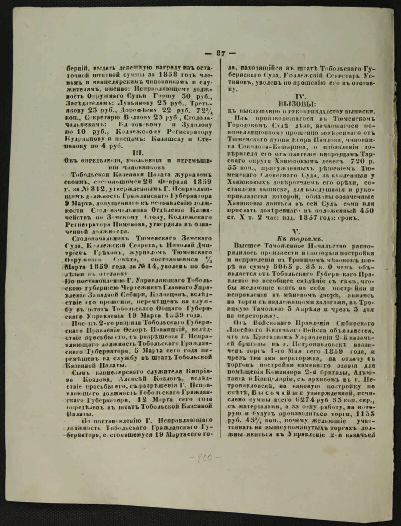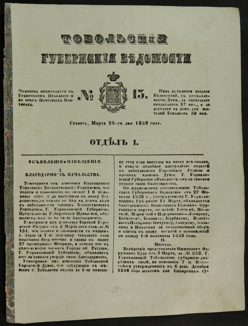 Тобольские губернские ведомости. - 1857, 27 апр. - 1918, 3 апр. - Тобольск, 1857-1918. - Выходили в 2 ч.: офиц. и неофиц.; с 1893 по 1897 обе части изд. раздельно. Прил.: Ежегодник Тобольского губернского музея. Вып. 7-8. 1896-1897 ; Рукописи библиотеки Тобольского губернского музея за XVII и первую четверть XVIII столетия. 1645-1676. (Вып. 2-й). 1896 ; Отдел сельского хозяйства и кустарной промышленности. 1896-1906 ; Школьный отдел при неофициальной части "Тобольских губернских ведомостей". 1907-1917 ; Прил. к отд. номерам. Указ.: за 1858-1867, 1893.