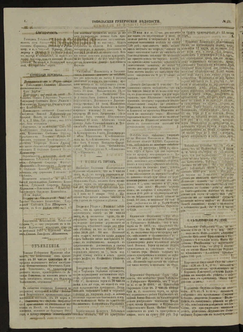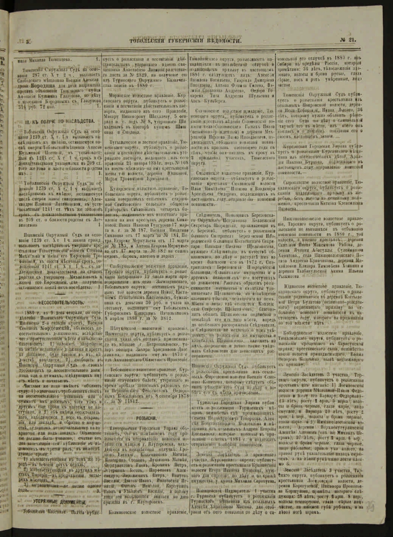 Тобольские губернские ведомости. - 1857, 27 апр. - 1918, 3 апр. - Тобольск, 1857-1918. - Выходили в 2 ч.: офиц. и неофиц.; с 1893 по 1897 обе части изд. раздельно. Прил.: Ежегодник Тобольского губернского музея. Вып. 7-8. 1896-1897 ; Рукописи библиотеки Тобольского губернского музея за XVII и первую четверть XVIII столетия. 1645-1676. (Вып. 2-й). 1896 ; Отдел сельского хозяйства и кустарной промышленности. 1896-1906 ; Школьный отдел при неофициальной части "Тобольских губернских ведомостей". 1907-1917 ; Прил. к отд. номерам. Указ.: за 1858-1867, 1893.