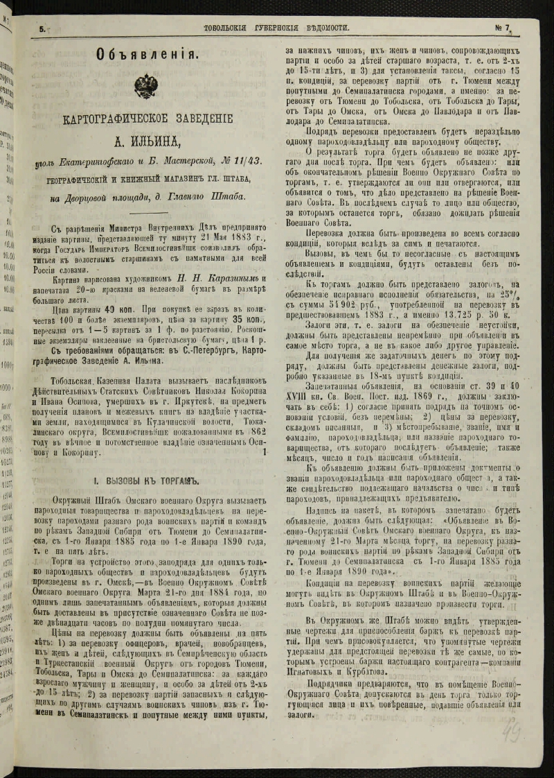 Тобольские губернские ведомости. - 1857, 27 апр. - 1918, 3 апр. - Тобольск, 1857-1918. - Выходили в 2 ч.: офиц. и неофиц.; с 1893 по 1897 обе части изд. раздельно. Прил.: Ежегодник Тобольского губернского музея. Вып. 7-8. 1896-1897 ; Рукописи библиотеки Тобольского губернского музея за XVII и первую четверть XVIII столетия. 1645-1676. (Вып. 2-й). 1896 ; Отдел сельского хозяйства и кустарной промышленности. 1896-1906 ; Школьный отдел при неофициальной части "Тобольских губернских ведомостей". 1907-1917 ; Прил. к отд. номерам. Указ.: за 1858-1867, 1893.