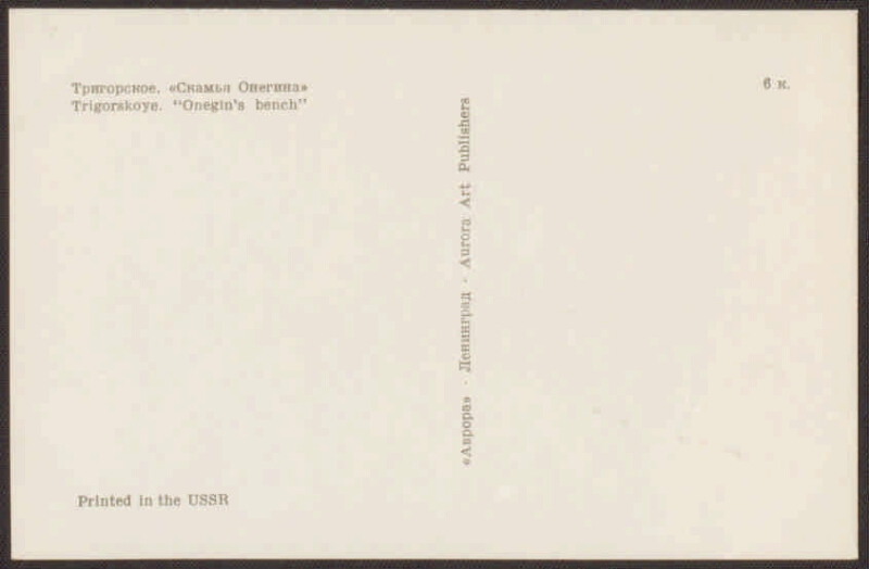 Тригорское. "Скамья Онегина" [Изоматериал : электронный ресурс] = Trigorskoye. "Onegin's bench" : [открытка]. - Электронные данные (2 файла : 2,5 МБ). - (Санкт-Петербург: Президентская библиотека имени Б. Н. Ельцина , 2014). - Режим доступа: интернет-портал Президентской библиотеки имени Б. Н. Ельцина. Заглавие с экрана. Заглавие и выходные данные на русском и английском языках. Электронная репродукция открытки: Тригорское. "Скамья Онегина" [Изоматериал] = Trigorskoye. "Onegin's bench". Ленинград: "Аврора", [между 1980 и 1990]. 1 открытка : цветной офсет. 6 коп. Местонахождение: Детский музей открытки, Санкт-Петербург. Копирование пользователями не разрешается.