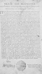 Указ его величества Петра Великого, императора и самодержца всероссийского. Обьявляется во всенародное известие : [О нетребовании работников и подвод безденежно и без указов Сената]. - Печатан в Санктъпитербурхе : При Сенате, 29 января 1724. - 1 л. - Издавалась также в Москве 15 апреля 1724 года. Имеется два варианта издания, отличающихся рис. М. П. Размер набора 228x165 мм. Справа от М. П.: Подлиннои за подписанием рук Правительствующаго Сената, генваря 20 дня, 1724 году. Указ Петра I от 20 января 1724 г. Заглавие дано по ПСЗ. (Т. 7, № 4425). Текст начинается словами: Понеже в данной генералитету и штап афицером, которые посланы в губернии и провинции, для свидетельства мужеска полу душ, и расположения полков Инструкции, за подписанием собственнои его величества руки написано, обьявить дворяном чтоб платили со всякои души мужеска полу по осьми гривен, а более того с них никаких податеи, подвод, и протчего небудет... СК 1708-1725