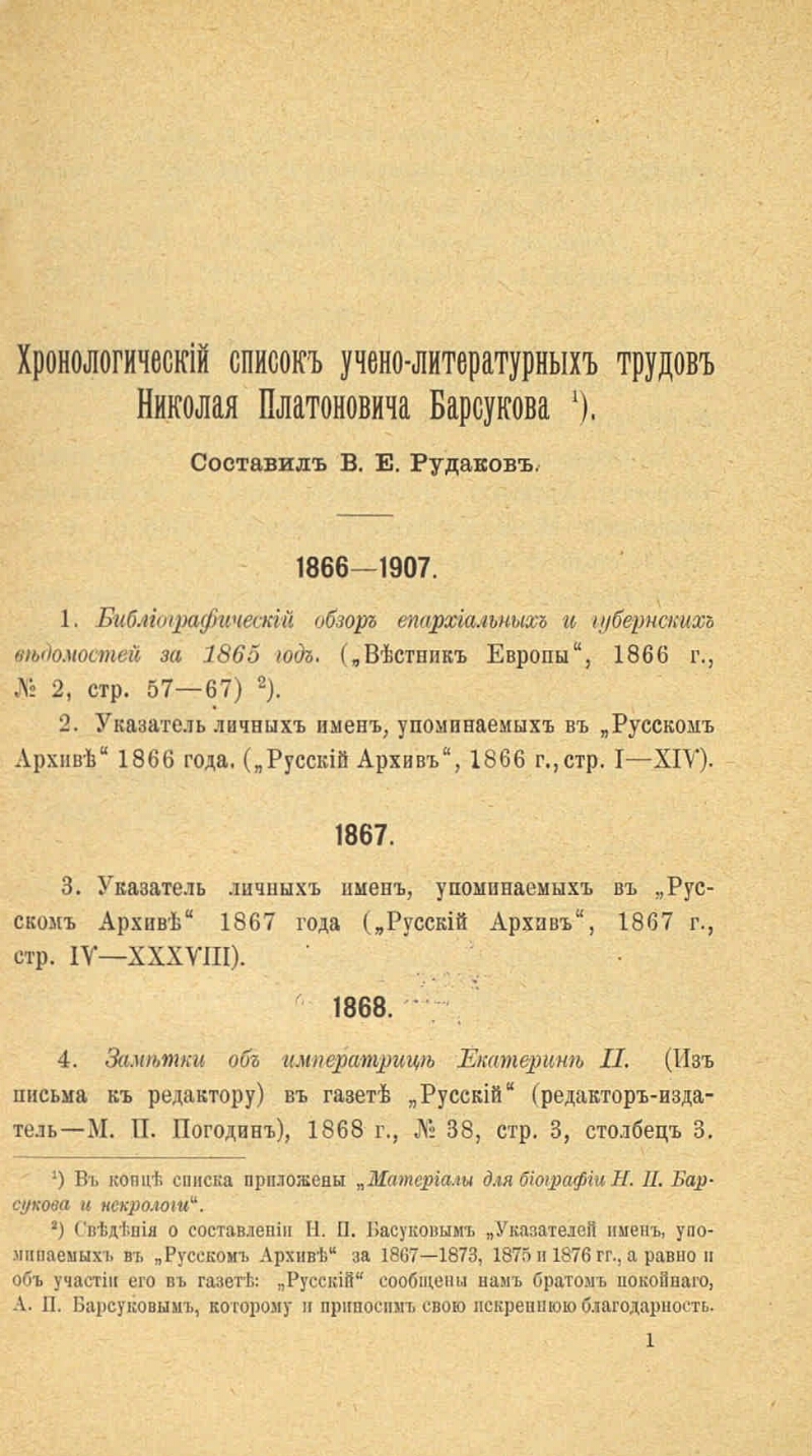 Хронологический список учено-литературных трудов Николая Платоновича Барсукова : с указанием материалов для биографии Н. П. Барсукова и некрологов его / составил В. Е. Рудаков ; Издание общества ревнителей русского исторического просвещения в память Императора Александра III. - С.-Петербург : типография М. М. Стасюлевича, 1909. - [2], 31 с. ; 24 см