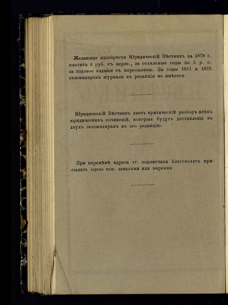 Юридический вестник : издание Московского юридического общества. - Г. 1 1867, кн. 1 (июль) - Г. 24 1892, т. 12. - Москва, 1867-1892. - Редакторы: Н. В. Калачев (1867-1870), с 1872 года - В. Н. Лешков и А. М. Фальковский, с 1878 года - В. Н. Лешков, М. М. Ковалевский и С. А. Муромцев; с 1880 года и до конца главным и постоянным редактором был С. А. Муромцев, а в качестве второго редактора являлись разные лица, часто сменявшиеся (В. Н. Лешков, М. М. Ковалевский, В. А. Гольцев, В. М. Пржевальский). Журнал без предварительной цензуры издавался в Москве в 1867-1892 годах Московским юридическим обществом и в Санкт-Петербурге (с 1860 по 1864 год в виде приложения к "Архиву Исторических и практических сведений"). Выходил с июля 1867 года по июнь 1868 года, после шестимесячного перерыва - в 1869 году, затем прекратился и возобновился лишь в апреле 1871 года, после чего выходил регулярно до конца 1892 года. Загл.: 1867/1868-1877 Юридический вестник, издаваемый Московским юридическим обществом; 1877-1892 Юридический вестник. Подзаг.: 1877-1892 Издание Московского юридического общества. Выходит взамен "Юридической газеты"
