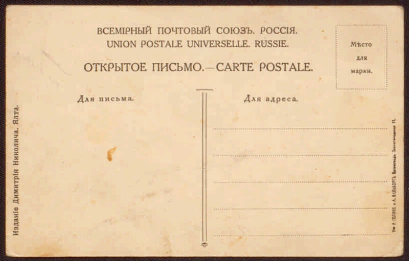 Ялта. Набережная [Изоматериал : электронный ресурс] : [открытка]. - Электронные данные (2 файла : 2,42 МБ). - (Санкт-Петербург: Президентская библиотека имени Б. Н. Ельцина , 2014). - Режим доступа: интернет-портал Президентской библиотеки имени Б. Н. Ельцина. Заглавие с экрана. Электронная репродукция открытого письма: Ялта. Набережная [Изоматериал]. Ялта : издание Димитрия Николича, [между 1914 и 1917] (Петроград : Т-во Р. Голике и А. Вильборг). 1 открытка : фототипия. На бланке Всемирного почтового союза. Местонахождение: Детский музей открытки, Санкт-Петербург. Копирование пользователями не разрешается