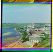 [V tsentre Preobrazhenskaia (Niol'skaia) tserkov', vnizu sprava Aleksandrovskaia chasovnia, na zadnem plane Voznesenskaia tserkov'. Sniato ot Borisoglebskogo sobora. Staritsa] [graphic] . - [1910]. - 1 negative (3 frames) : glass, b&w, three-color separation ; 24 x 9. - Title with new identification information provided by Yuri Krasilnikov in 2008, from the Web site Khramy Rossii [Churches of Russia], http://www.temples.ru/pg_mistakes.php