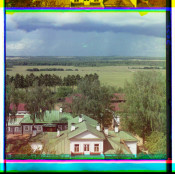 Vid s kolokol'ni Spaso-Borodinskago mon. na miestnost', gdie marsh. Nei vel ataku na fleshi Bagratеiona. Borodino [graphic] . - 1911. - 1 negative (3 frames) : glass, b&w, three-color separation ; 24 x 9 cm