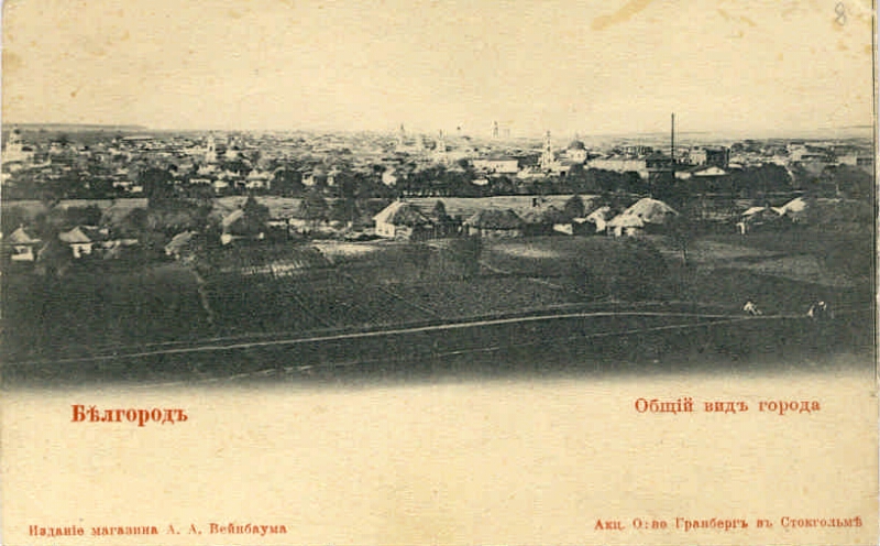 Белгород. Общий вид Белгорода [Изоматериал] : открытка. - Белгород : издание магазина А. А. Вейнбаума ; Стокгольм : О-во Гранберг, [между 1900 и 1904]. - Бромосеребряный отпечаток ; 9х14. - Год издания и справочные данные установлены по изд.: Курская губерния на старой открытке / сост. и описал Ю. В. Данченко. Курск, 2004. - На бланке Всемирного почтового союза. - Изображение горизонтальное. - Общий вид города со стороны слободы Пушкарной с юга (из-за железной дороги)
