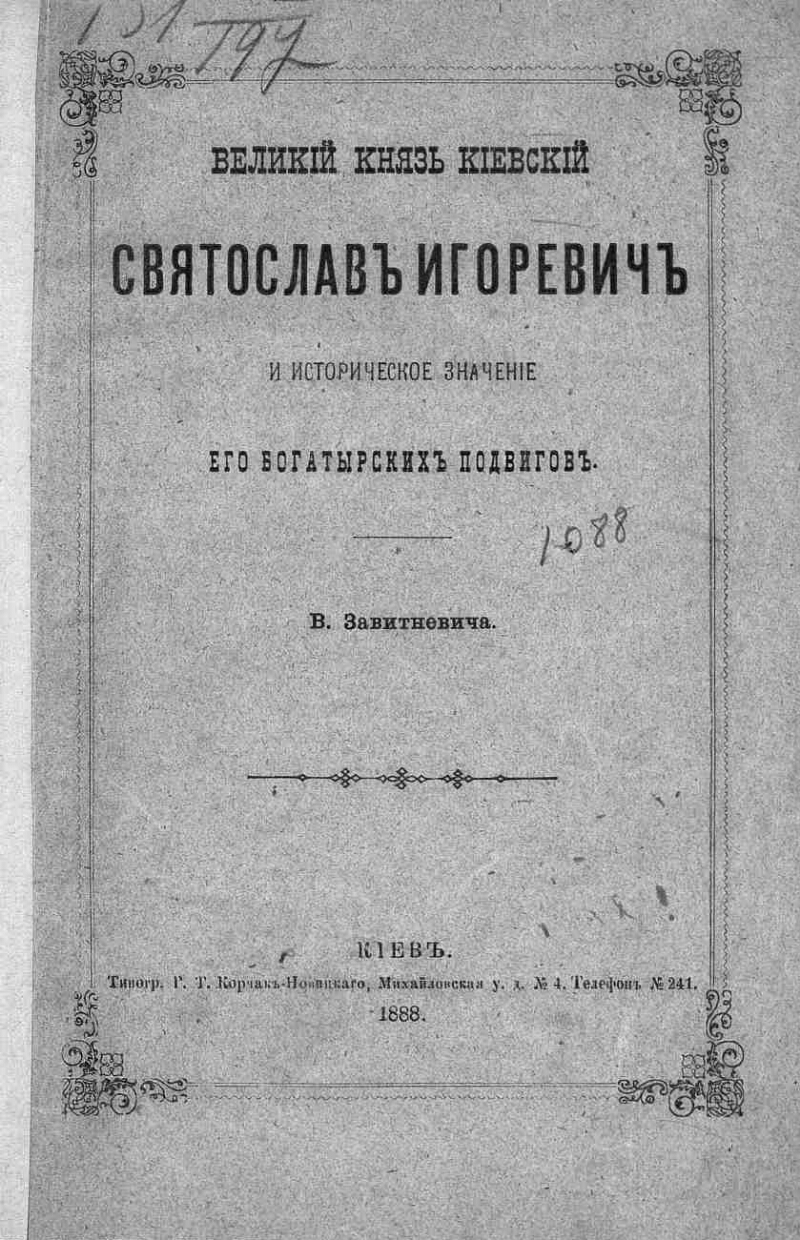 Великий князь киевский Святослав Игоревич и историческое значение его богатырских подвигов / [Соч.] В. Завитневича. - Киев : тип. Г.Т. Корчак-Новицкого, 1888. - [2], 23 с. ; 24