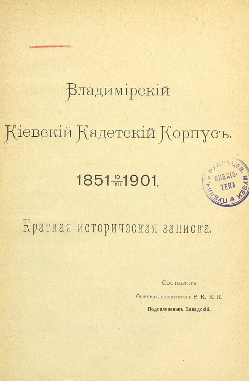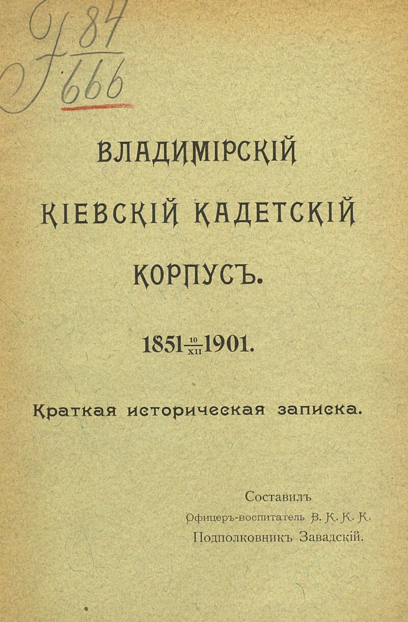 Автор Завадский Нил Павлович Описание Завадский, Нил Павлович (1863-?). rus Владимирский киевский кадетский корпус. 1851 10/XII 1901: Краткая историческая записка/ сост. офицер-воспитатель В. К. К. К. подполковник Завадский .- Киев : Тип. Р. К. Лубковского , 1901 .- 19 с. ; 21 см . ББК 63.3(4Укр)522-35 Источник: РГБХранение: РГБ Издательство Тип. Р. К. Лубковского Объект в каталогах История В коллекциях Государственные праздники России: история и современность → День Героев Отечества – 9 декабря → История праздника → Защита Отечества: на фронте и в тылу → Вооружённые силы → Коллекции → Русская императорская армия → Военно-учебные заведения → Пажеский корпус и кадетские корпуса → История кадетских корпусов