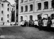 Военный министр В. А. Сухомлинов, находящийся в свите Императора Николая II на торжествах, посвященных 200-летию присоединения Лифляндии к России, присутствует на смотре сокольской гимнастики во дворе Николаевской гимназии [Изоматериал] : [фотография] / фото К. Е. фон Ган и К°. - Рига, 4 июля 1910. - Контактная печать со стеклянной фотопластины, черно-белая ; 18х24 см. - Среди присутствующих: К. Д. Нилов (2-й от Николая II), В. Б. Фредерикс (3-й от Николая II). Российский государственный архив кинофотодокументов. http://www.rgakfd.ru/.