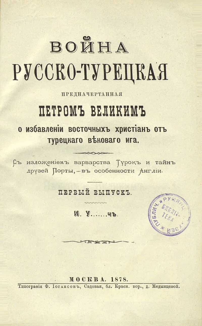 Война русско-турецкая, предначертанная Петром Великим о избавлении восточных христиан от турецкого векового ига : с изложением варварства турок и тайн друзей Порты, в особенности Англии / И. У ... ч. - Москва : Типография Ф. Иогансон, 1878. - 21 см