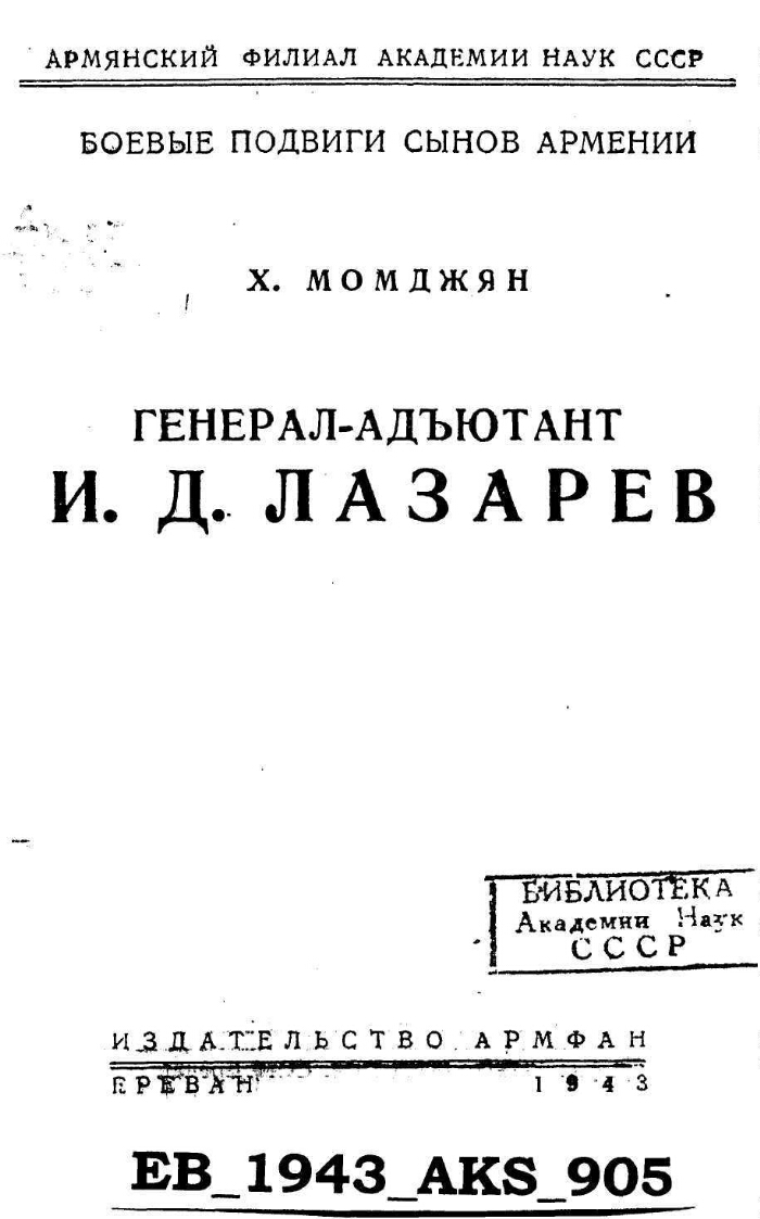 Генерал-адъютант И. Д. Лазарев / Х. Момджян ; Армянский филиал АН СССР. - Ереван : издательство АРМФАН, 1943. -31, [1] с. : портр.. - (Боевые подвиги сынов Армении : под редакцией академика И. А. Орбели). - Заглавие обложки: Генерал Лазарев. На обложке автор не указан. . -2000 экз.