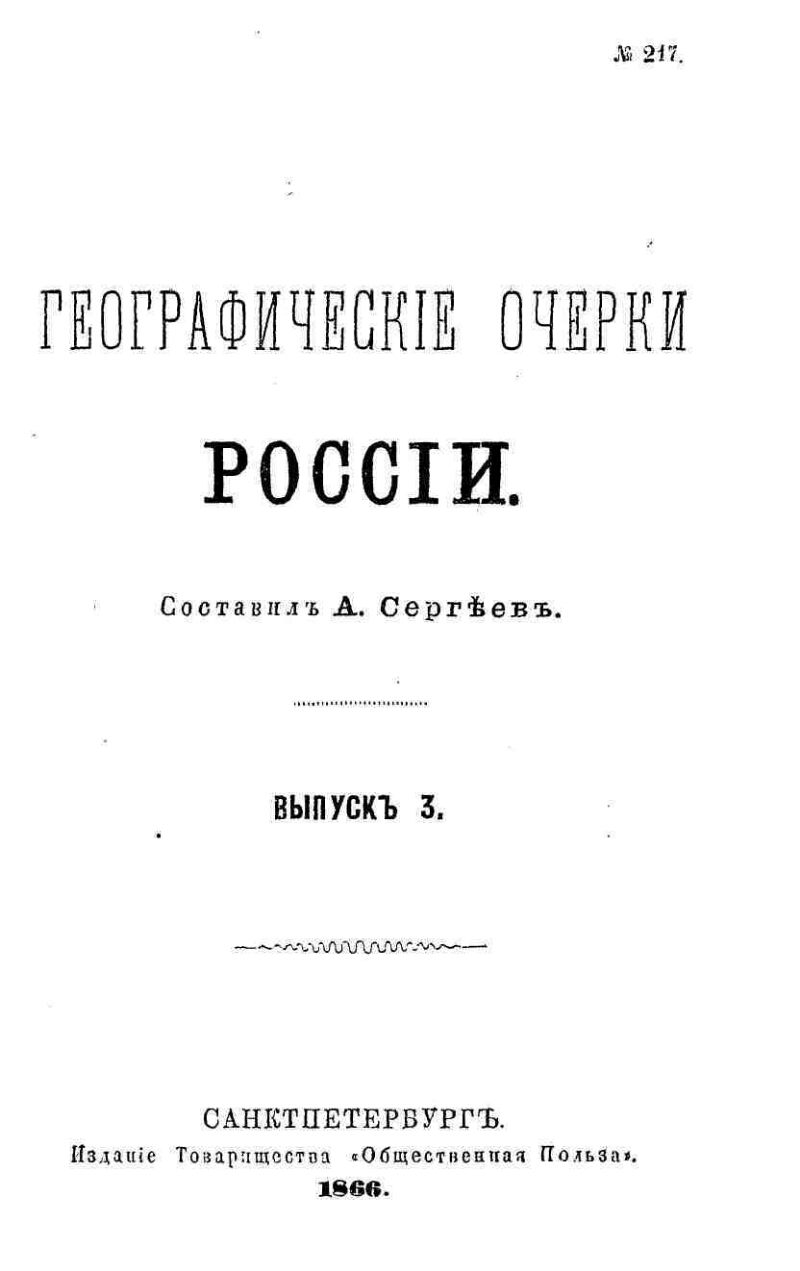 Север Европейской России ; 2) Страна великих озер ; 3) Поволжье ; 4) Кама с Вяткою и Белою ; 5) Область Оки. - 1866. - 115 с. - На тит. л. номер изд.: № 217. - На обл. дата: 1867