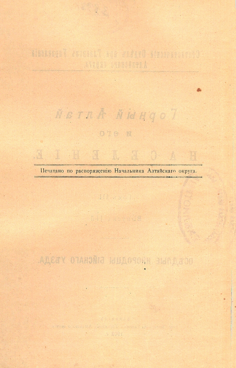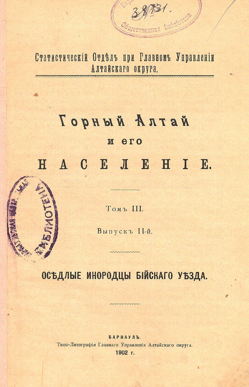 Горный Алтай и его население : [в 4 т.] / Статистический отдел при Главном управлении Алтайского округа. - Барнаул : Типо-литография Главного управления Алтайского округа, 1900-1903. - 26 см. -