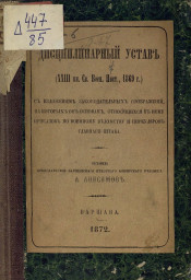 Дисциплинарный устав (XXIII кн. Св. воен. пост., 1869 г.) : с изложением законодательных соображений, на которых он основан, относящихся к нему приказов по Военному ведомству и циркуляров Главного штаба / составил преподаватель А. Анисимов. - Варшава : тип. Варшавск. жандармск. окр., 1872. - [2], IV, II, 120 с. ; 18 см. - Библиогр. в примеч.