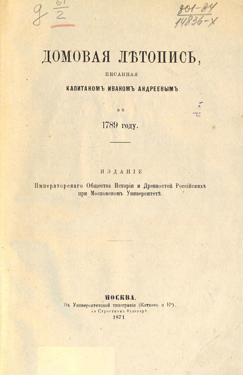 Автор Андреев Иван Описание Андреев, Иван (18 в.). Домовая летопись, писанная капитаном Иваном Андреевым в 1789 году. - Москва : Унив. тип. (Катков и К), 1871. - 114 с. ; 28 см . ББК 63.3(2)51-283.3 Источник копии: РГБМесто хранения оригинала: РГБ Издательство Унив. тип. (Катков и К) Объект в каталогах Россия в кон. XVII