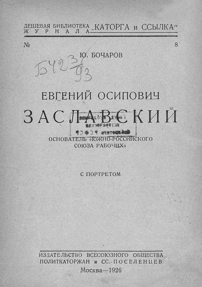 Евгений Осипович Заславский : основатель "Южно-Российского союза рабочих" : с портр. - Москва : Всесоюз. о-во политкаторжан и сс.-поселенцев, 1926. - 30 с. : портр.. - (Дешевая библиотека журнала "Каторга и ссылка" ; № 8) . - 16000 экз.