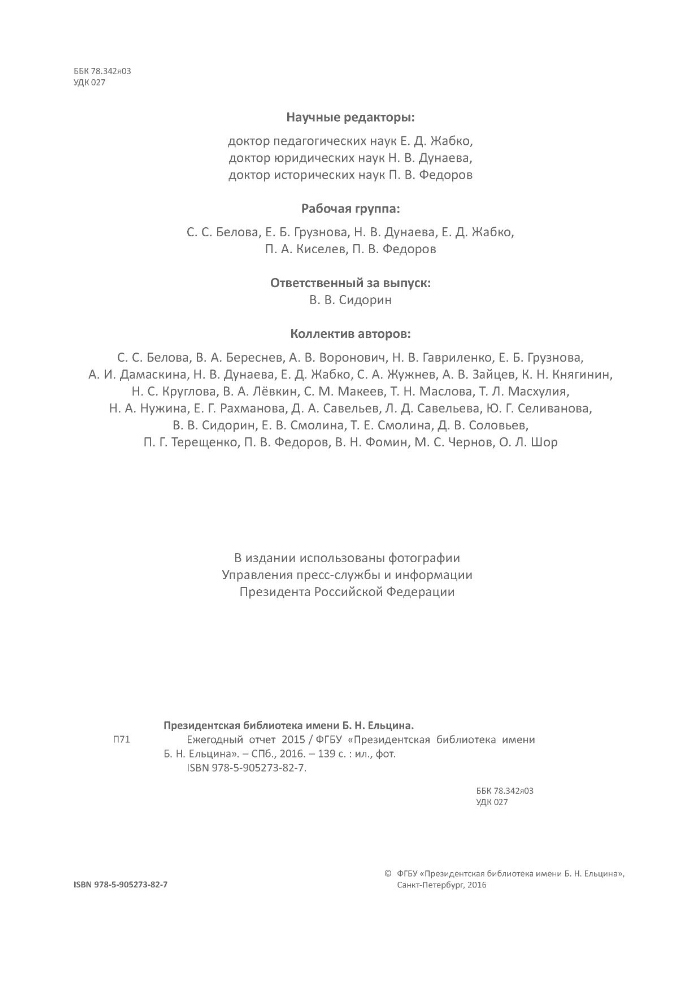 ... 2015 / [научные редакторы: доктор педагогических наук Е. Д. Жабко, доктор юридических наук Н. В. Дунаева, доктор исторических наук П. В. Федоров]. - 2016. -139 с. : цв. ил., портр., диагр.. -10 экз. -ISBN 978-5-905273-82-7