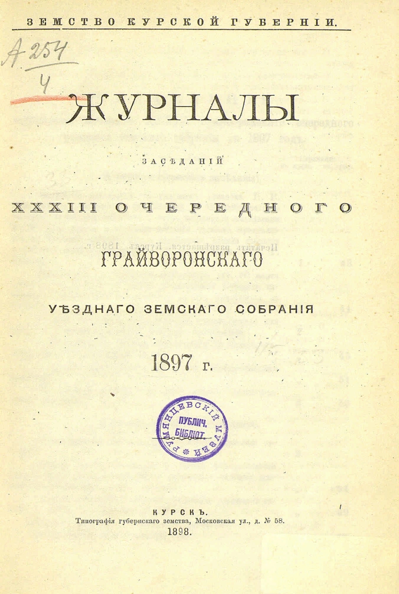XXXIII очередного ... 1897 года. - Тип. губерн. земства, 1898. - [2], VIII, 516 с. - В надзаг.: Земство Курской губернии Печать Публичной библиотеки Румянцевского музея