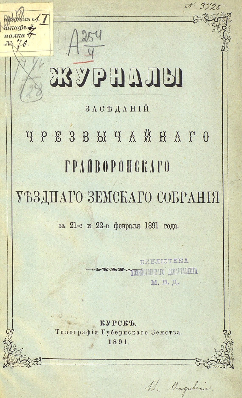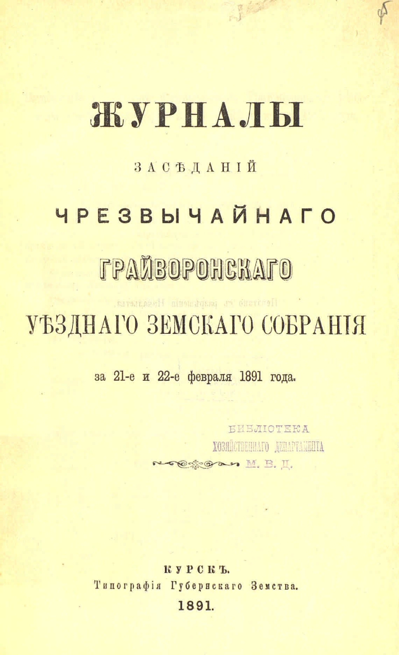 чрезвычайного ... за 21-е и 22-е февраля 1891 года. - Тип. губерн. земства, 1891. - [3], 25 с. - Печать библиотеки хозяйственного департамента МВД