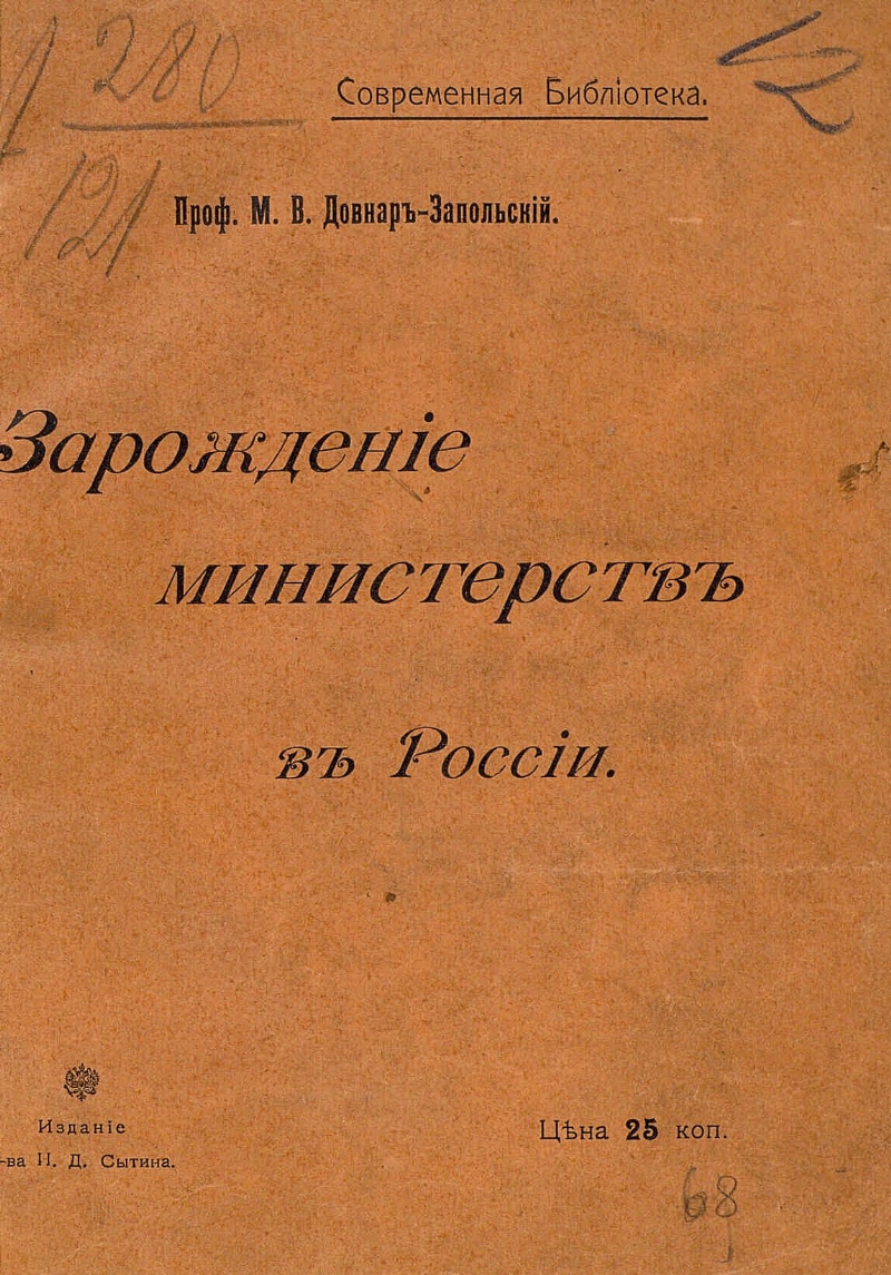 Зарождение министерств в России / проф. М. В. Довнар-Запольский. - Москва : Издание Т-ва И. Д. Сытина, 1906. - 83 с. ; 21 см. - (Современная библиотека). - Библиогр. в примеч.