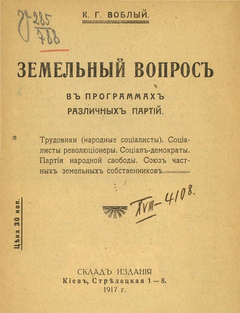 Земельный вопрос в программах различных партий. Трудовики (народные социалисты). Социалисты революционеры. Социал-демократы. Партия народной свободы. Союз частных земельных собственников/ К. Г. Воблый .- Киев : Б. и. , 1917 .- 30 с. ; 17 см