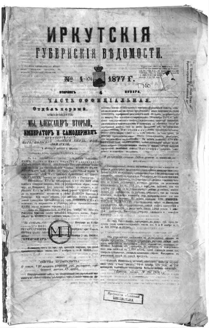 Описание Иркутские губернские ведомости . - Иркутск : Иркутское губернское правление , 1857- 1877, № 1. - 2 с. . 1. История - Периодические издания - Россия ББК 63.3(28-8Ирк)522я51 Источник копии: Иркутская ОГУНБМесто хранения оригинала: Иркутская ОГУНБ Издательство Иркутское губернское правление Объект в каталогах История В коллекциях Отечественная периодика в фонде Президентской библиотеки → Газеты → И → Иркутские губернские ведомости. Иркутск. → 1877
