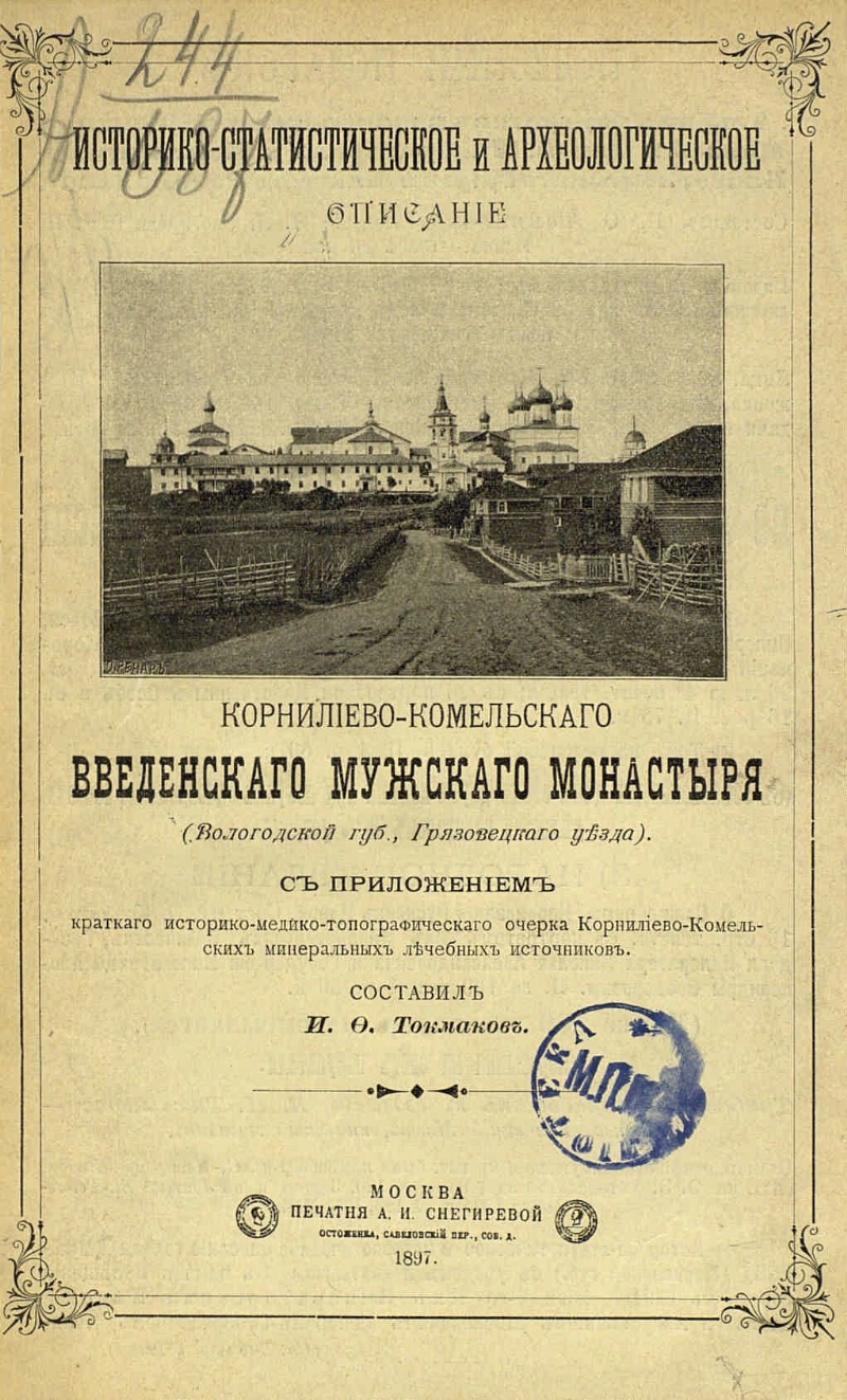 Историко-статистическое и археологическое описание Корнилиево-Комельского Введенского мужского монастыря (Вологодской губ., Грязовецкого уезда): с приложением краткого историко-медико-топографического очерка Корнилиево-Комельских минеральных лечебных источников/ сост. И. Ф. Токмаков .- Москва : Печатня А. И. Снегиревой , 1897 .- 36 с. : ил. ; 22 см