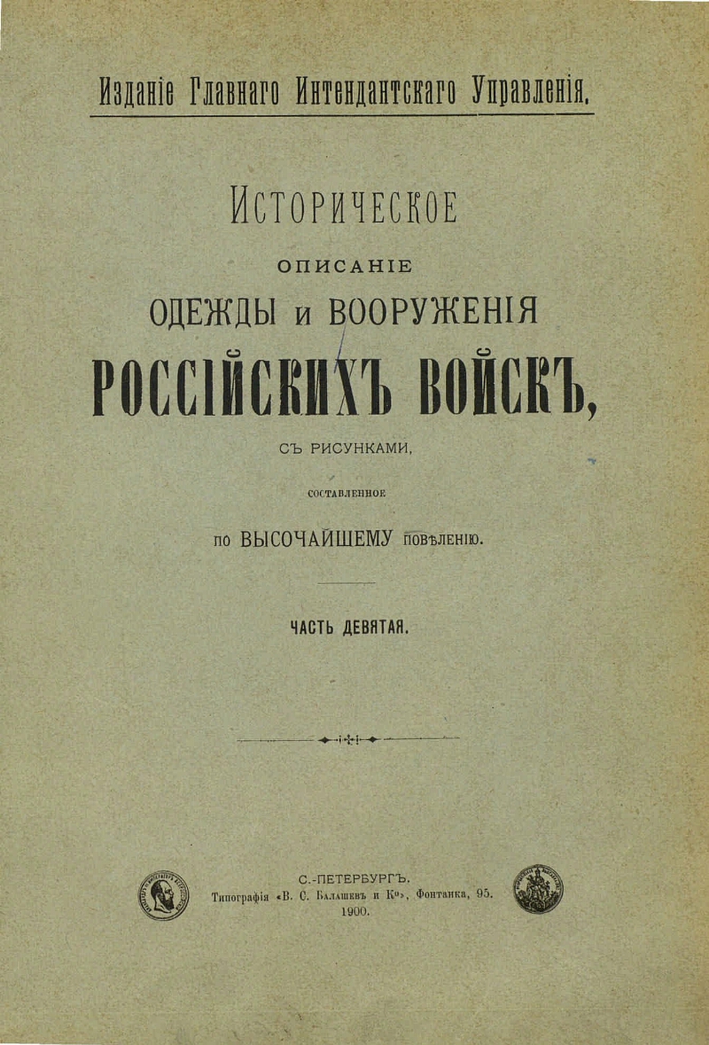 Автор Висковатов Александр Васильевич Описание Висковатов, Александр Васильевич (1804-1858). Историческое описание одежды и вооружения Российских войск: с рисунками, составленное по Высочайшему повелению .- Санкт-Петербург : издание Главнаго интендантскаго упр. , 1899-1948 .- 27 см rus Ч. 9 .- 1900 .- 107 с., [117] л. ил. . ББК Т3(2)0-54я6ББК 63.3(2)4-35я61ББК 63.3(2)5-35я61 Источник: РГБ Издательство издание Главнаго интендантскаго упр. В коллекциях Государственные праздники России: история и современность → День Героев Отечества – 9 декабря → История праздника → Защита Отечества: на фронте и в тылу → Вооружённые силы → Коллекции → Русская императорская армия → Форма Русской императорской армии и флота → История формы