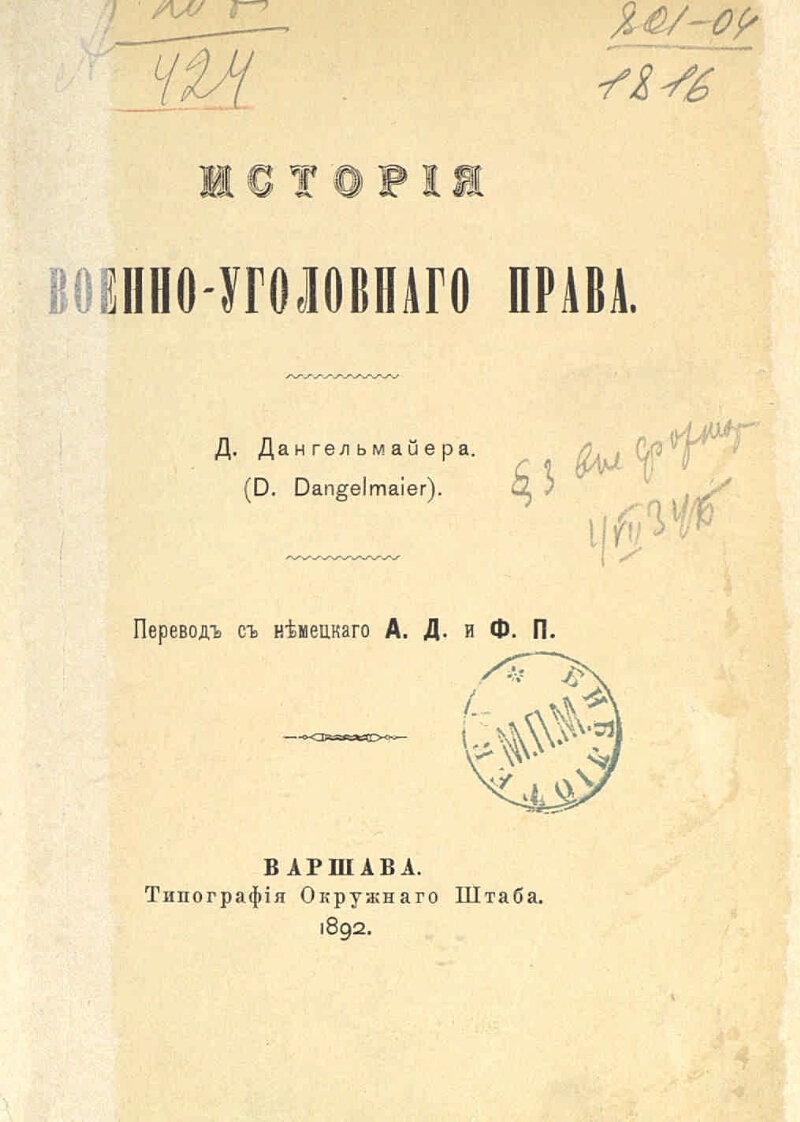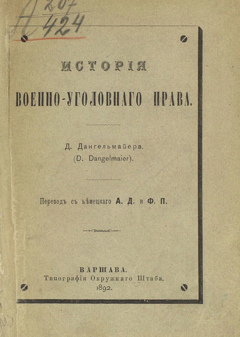Автор Дангельмайер Эмиль Ф. П. А. Д. Описание Дангельмайер, Эмиль rus История военно-уголовного права/ [соч.] Д. Дангельмайера (D. Dangelmaier) Пер. с нем. А. Д. и Ф. П. .- Варшава : тип. Окр. штаба , 1892 .- [4], 104 с. ; 20 см .- Библиогр. в прим. . ББК 68.427ББК 67.711.41-1 Источник: РГБХранение: РГБ Издательство Тип. Окр. штаба Объект в каталогах Вооруженные силы в целом Судебная система В коллекциях Государственные праздники России: история и современность → День Героев Отечества – 9 декабря → История праздника → Защита Отечества: на фронте и в тылу → Вооружённые силы → Коллекции → Русская императорская армия → Законодательство → Уставы, наставления, инструкции → Военное судопроизводство, дисциплинарные уставы и уставы о наказаниях