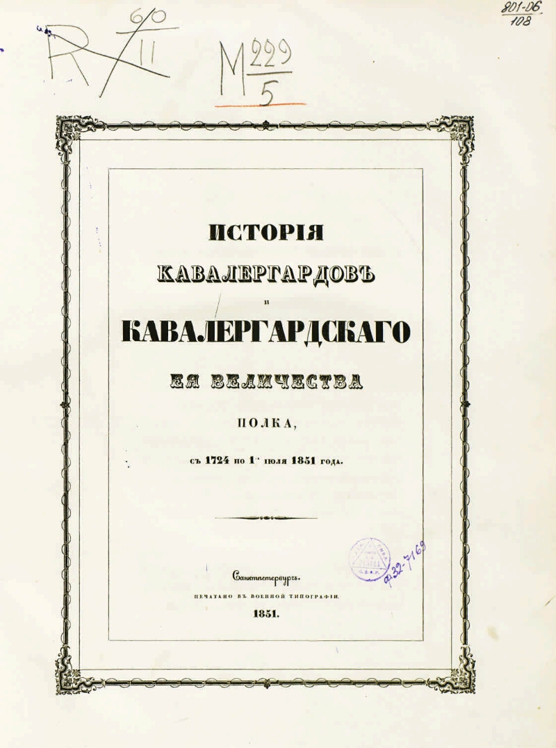 История кавалергардов и Кавалергардского Ее Величества полка, с 1724 по 1-е июля 1851 года. - Санктпетербург : Печ. в воен. тип., 1851. - [7], 138, CXXXV, [5] с. ; 46 см. - Часть текста на фр. яз.