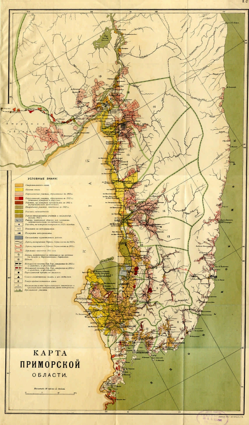 Карта Приморской области [Карты]. - [1 : 168 000], 40 верст в дюйме (1, 7 км в 1 см). -СПб : Картогр. зав. Г. де-Кельш, [после 1911]. -1 к. : цв. ; 38х67 (46х77). - Картогр. сетка через 2°. Установл. долг. от Пулкова. Без рельефа. Усл. знаки: старожил. и казачьи земли, переселен. участки, образ. до и в 1912 г., торгово-пром. участки и ж.-д. пос., р-н, охвачен. гидротехн. исслед., водохранилища, дороги, дорож. изыскания, церкви, школы, мед. пункты, переселен. пункты по движению, склады, крестьян. участки и др. Карта из экз. Омской ГОНБ с загл. обл.: Карты [Сибири].