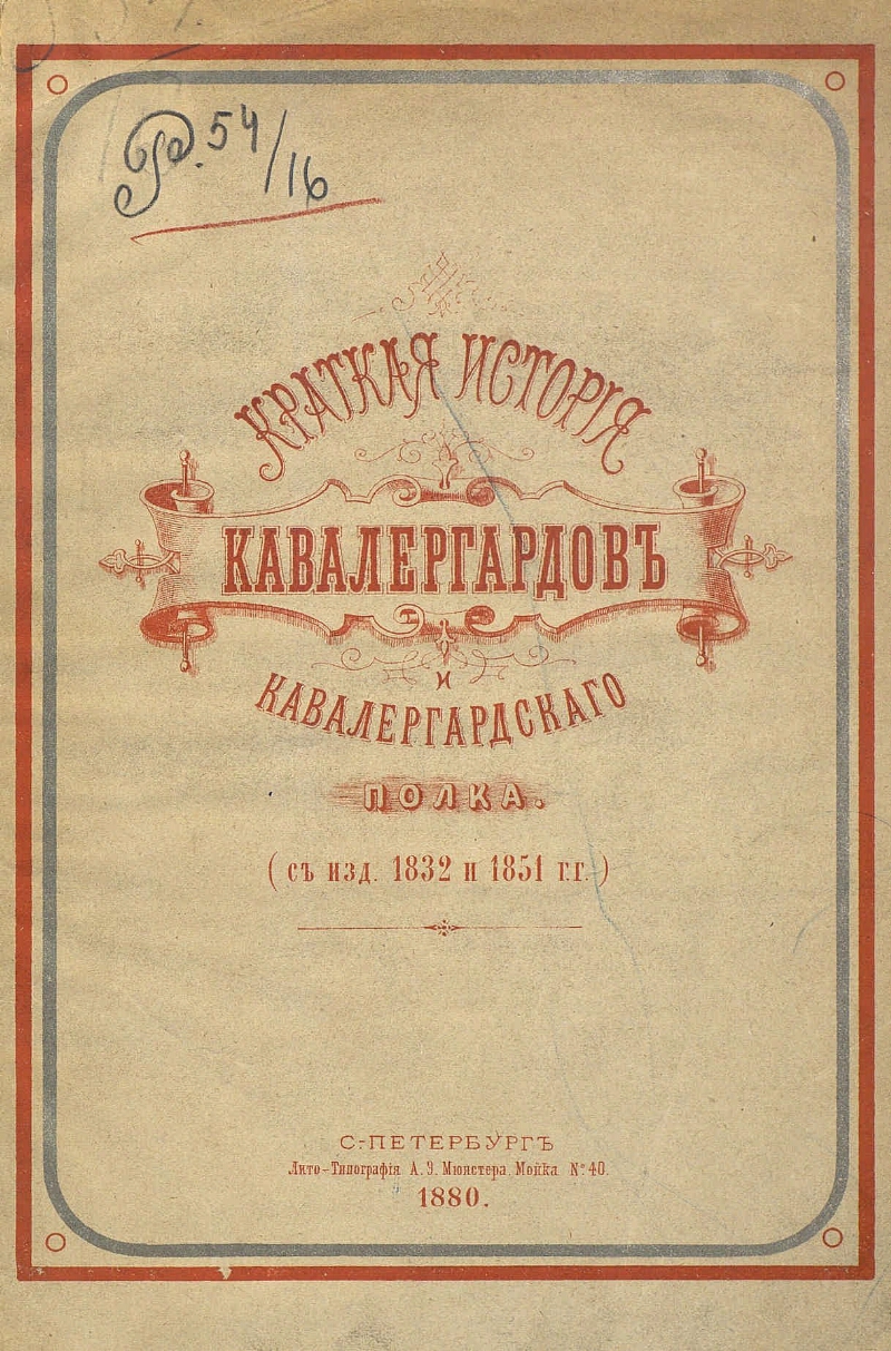 Описание Кавалергардский полк Краткая история кавалергардов и Кавалергардского полка : (с изд. 1832 и 1854 гг.). - С.-Петербург : Лито-тип. А.Э. Мюнстера, 1880. - [2], 24 с. : ил. ; 26 см . ББК 68.519.1-1(2) Источник копии: РГБМесто хранения оригинала: РГБ Издательство Лито-тип. А.Э. Мюнстера Объект в каталогах Сухопутные войска В коллекциях Государственные праздники России: история и современность → День Героев Отечества – 9 декабря → История праздника → Защита Отечества: на фронте и в тылу → Вооружённые силы → Коллекции → Русская императорская армия → Рода войск и службы → Гвардейский корпус → Кавалерия → История отдельных полков → Кавалергардский полк