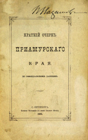 Краткий очерк Приамурского края : по официальным данным. - С.-Петербург : Военная типография, 1892. -[3], 65 с., 2 л. к. ; 24. - Авт. в кн. не указан ; установлен по изд.: Рус. аноним. и подпис. псевд. произведения печати, 1801-1926. Л., 1977. Вып. 1. С. 142.