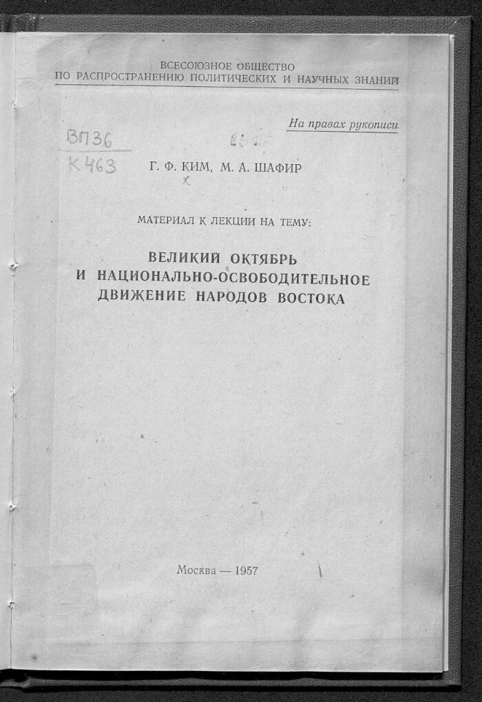 Материал к лекции на тему: Великий Октябрь и национально-освободительное движение народов Востока / Г. Ф. Ким, М. А. Шафир ; Всесоюзной общество по распространению политических и научных знаний. - Москва, 1957. -29 с. ; 22 см. - На правах рукописи. . -25000 экз.