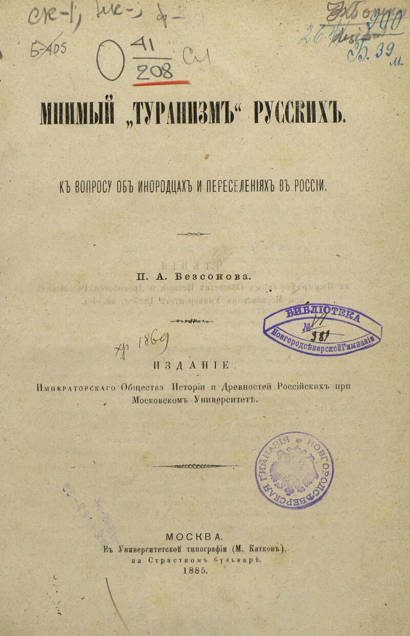 Автор Бессонов Петр Алексеевич Описание Бессонов, Петр Алексеевич (1828-1898). rus Мнимый "туранизм" русских: К вопросу об инородцах и переселениях в России/ [соч.] П. А. Бессонова Изд. Имп. об-ва истории и древностей российких при Моск. ун-те .- Москва : В Универ. тип. (М. Катков) , 1885 .- 135 с. ; 26 см . ББК 63.57(=411.2)-73 Источник: РГБХранение: РГБ Издательство В Универ. тип. (М. Катков) Объект в каталогах Этнология (этнография, народоведение)
